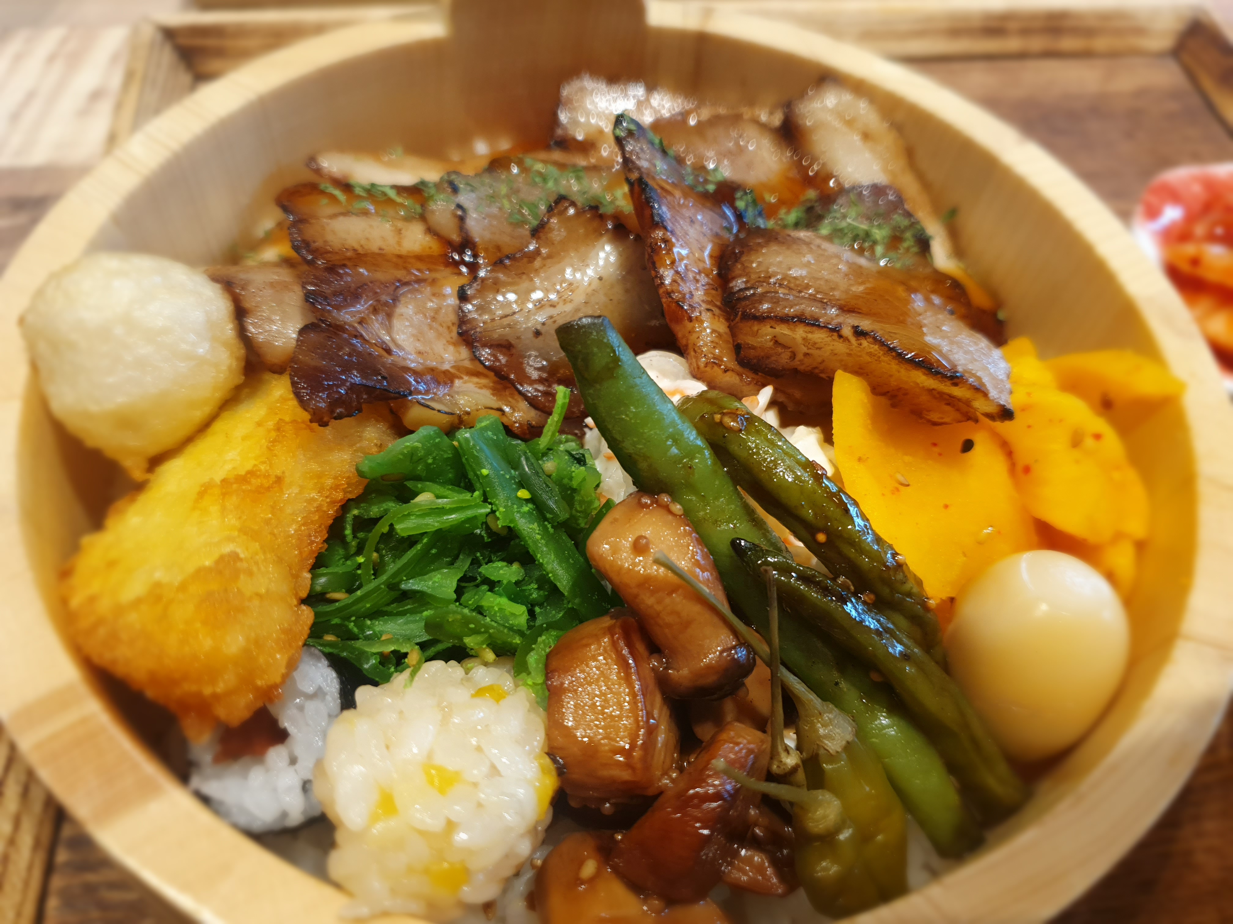 저는 차슈벤또와 기혼함박정식을 주문했습니다. 먼저, 이 곳의 인기메뉴 차슈벤또입니다. 특제 소스에 삶아 담아낸 돼지고기 벤또인데요. 차슈가 꽤 여러장 들어가 있습니다. 그리고 미니 김밥, 해쉬브라운, 메추리알, 계란 등 부재료들도 상당히 가득 차있습니다. 물론 저는, 사실 벤또가 조금 더 깊은 줄 알았습니다. 그렇다고 양이 부족한 편은 아닙니다. 정말로 벤또가 더욱 깊어 보였을 뿐입니다...! 벤또 같은 경우는 벤또와 김치, 미소된장국 이렇게 한 상이 나옵니다.