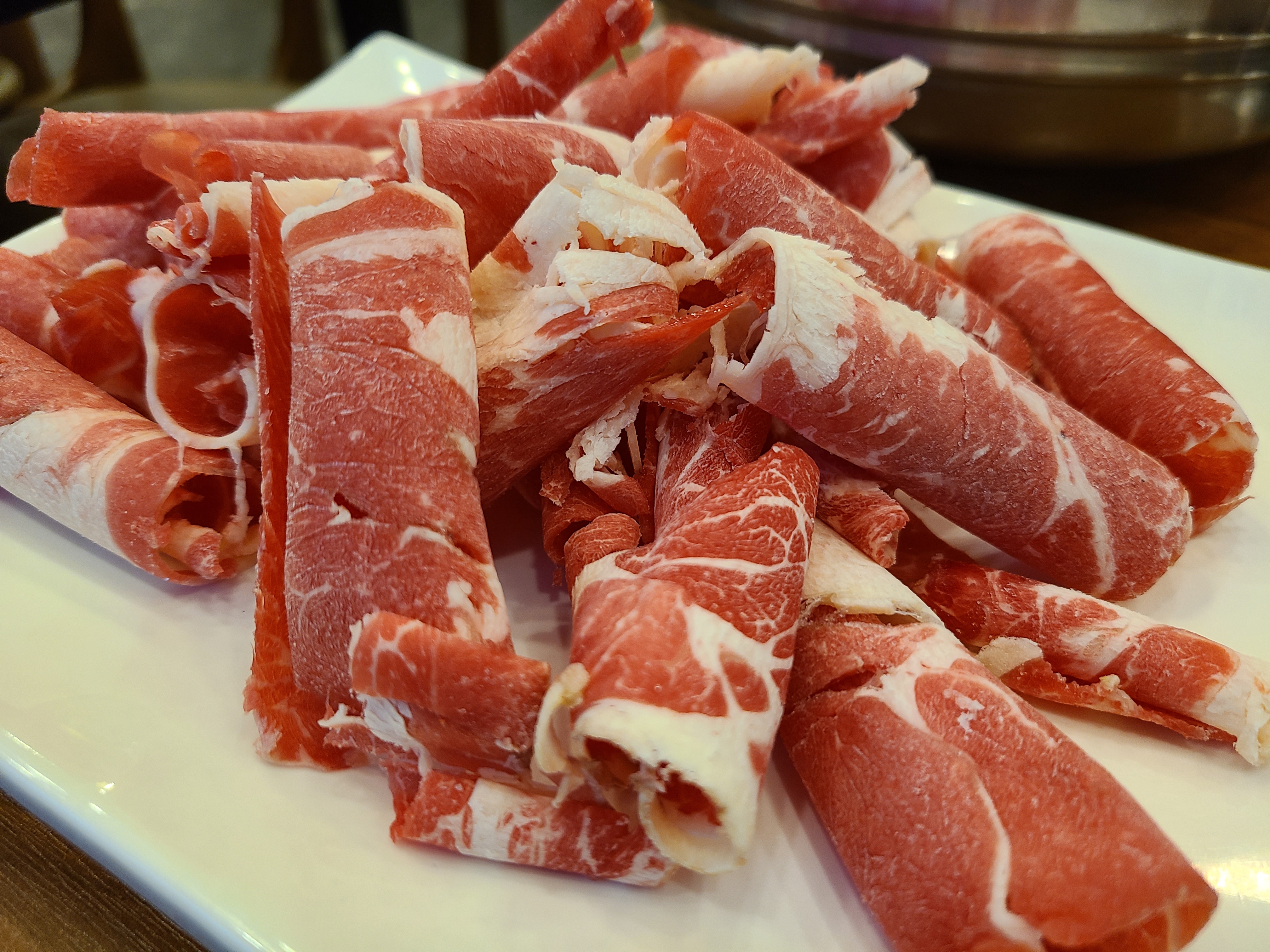 주문 후 음식은 금방 세팅이 됩니다. 육수를 콸콸 끓이는 중에 고기와 야채 등이 나옵니다. 육수는 적당히 딱 알맞게 간이 되어있어요. 더도 덜도 말고, 딱 좋은. 그런 따끈한 국물이었습니다.