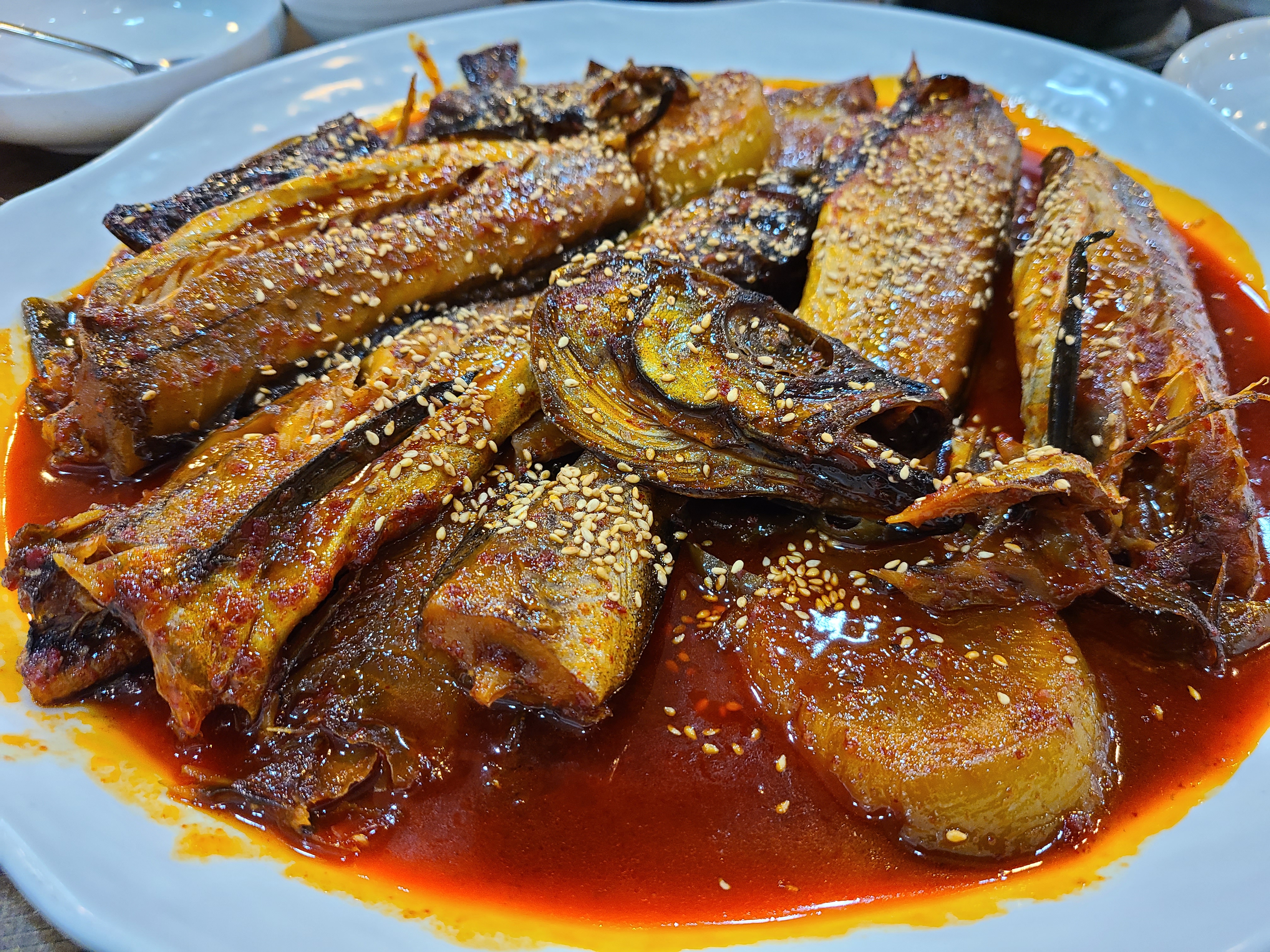 코다리양은 꽤 많은 편이에요. 소자 시켰는데 둘이 먹기 버거울 정도였습니다. 딱 셋이 먹으면 적당할 양인 거 같아요. 총 네마리 정도 나오는 거 같더라구요. 코다리랑 같이 나오는 무도 정말 맛있어서, 무를 먹으려고 삼포가는 길을 찾는 사람도 있다는 농담도 있다네요 :)