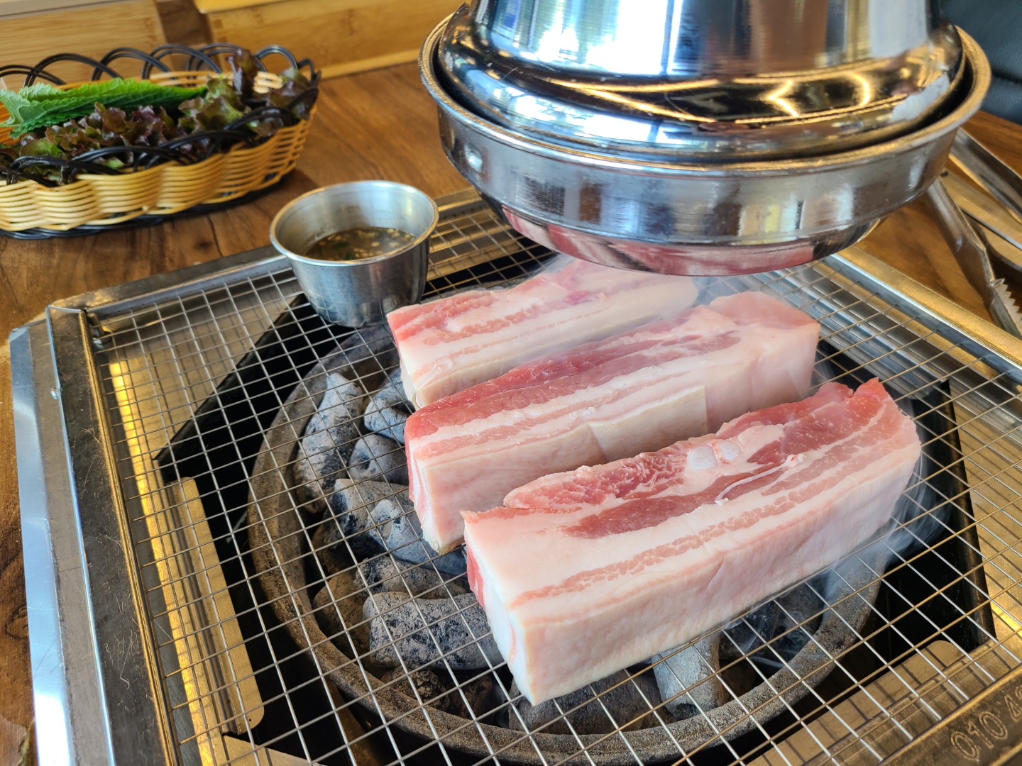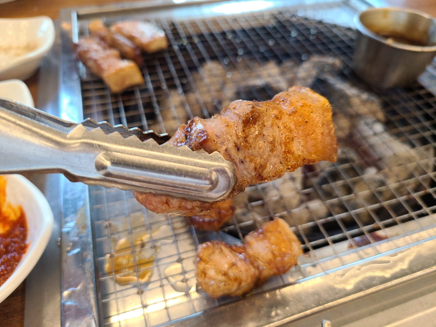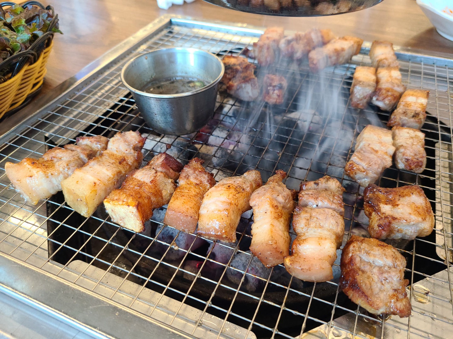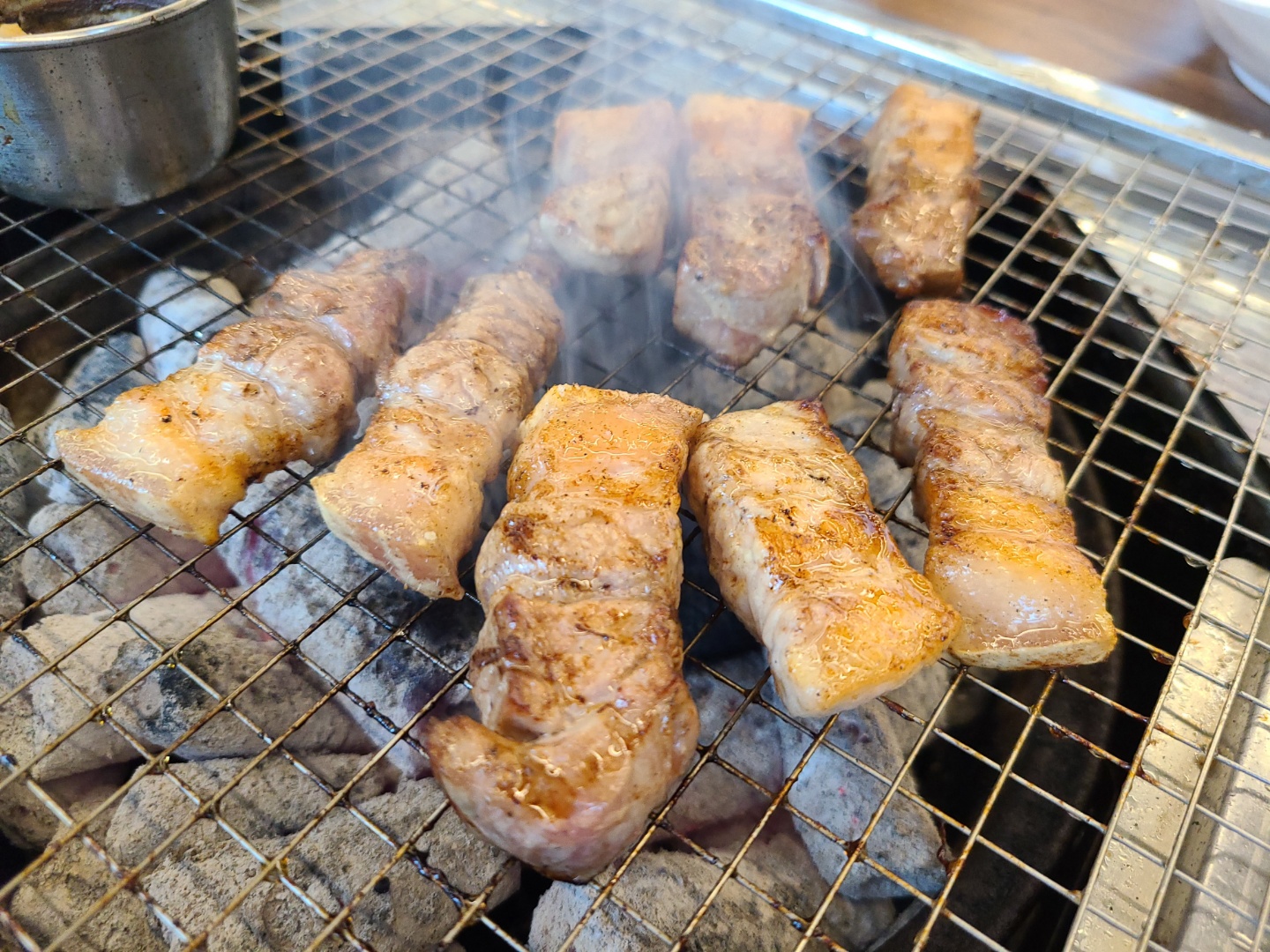 이 곳의 좋은점, 일단 고기를 직접 구워주셔서 왠만하면 고기를 맛나게 드실 수 있어요. 간편하기도 하죠. 그리고 생대나무 숯을 사용해 고기 냄새가 옷에 베지 않습니다. 그을음도 없고요.