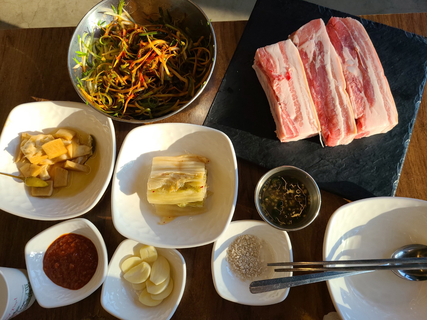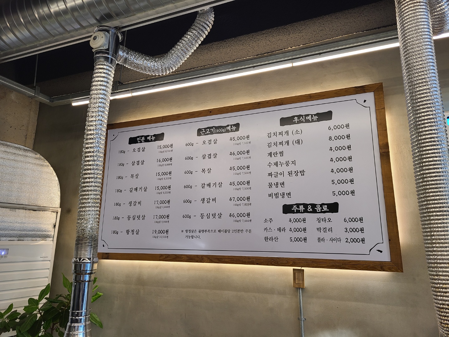 원랜 인분 메뉴로 오겹살 2인을 주문했는데, 사장님 추천으로 근고기 메뉴로 변경했습니다. 근고기 메뉴가 양이 조금 더 많다고 하셨어요.