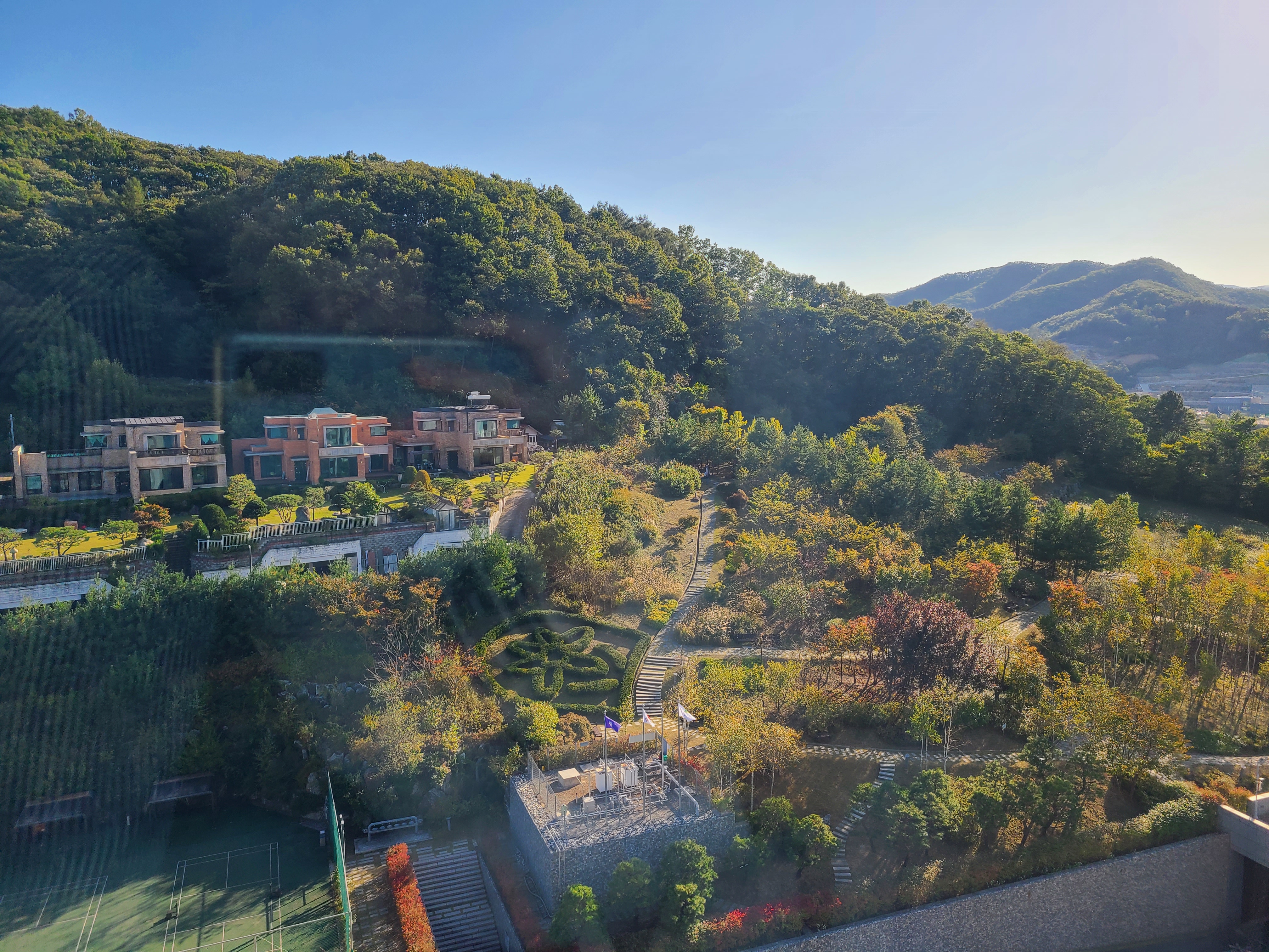 환하고, 푸릇한게. 정말 예뻤던 객실뷰. 객실 뒷쪽 모습인데요. 대부분이 펜션이고, 아랫쪽엔 운동시설이 있네요. 날씨가 워낙 화창해서 창문으로 내다보고만 있어도 '힐링' 그 자체 였어요.