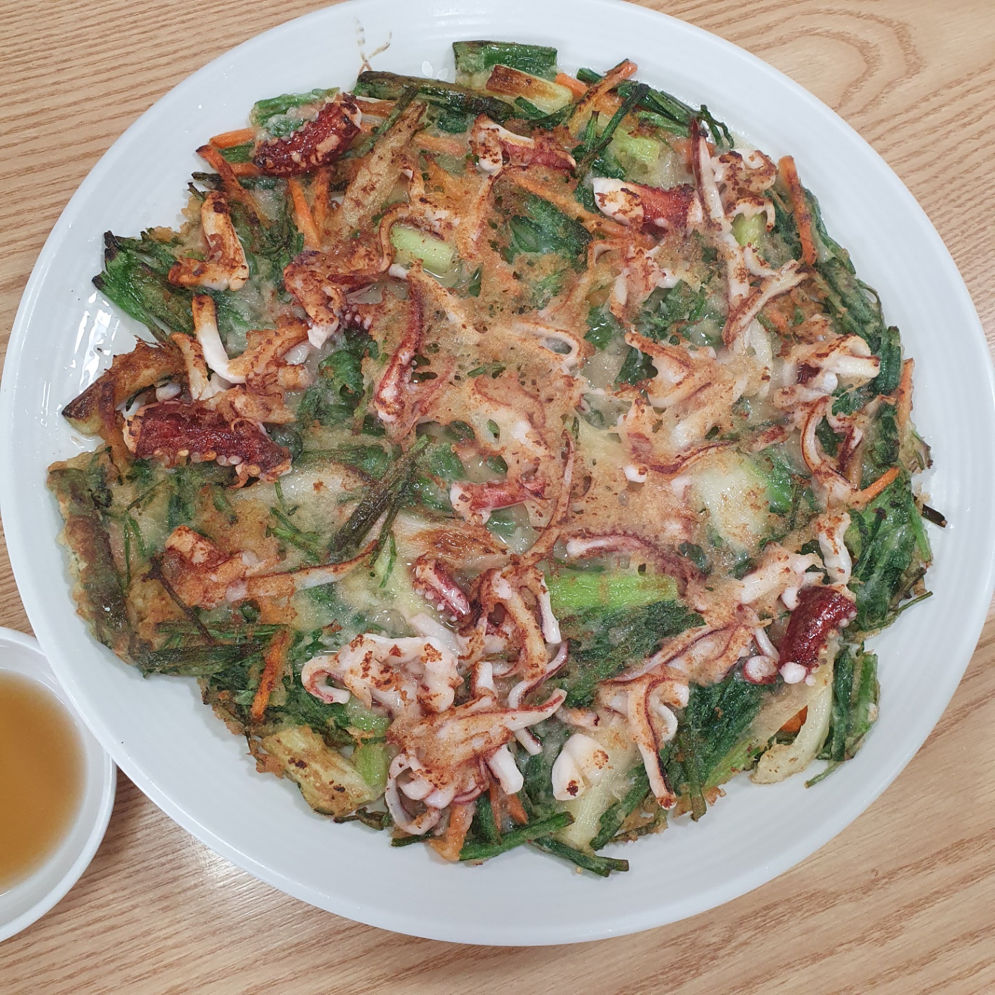 밀가루도 그리 두껍지 않아서 오징어의 쫄깃한 식감과 담백함, 바삭한 튀김까지 제대로 느낄 수 있었어요. 특히 기름이 좔좔, 바삭하게 튀겨져 갓 나온 해물전을 곧바로 찢어서 먹는 느낌 아시죠? ❥