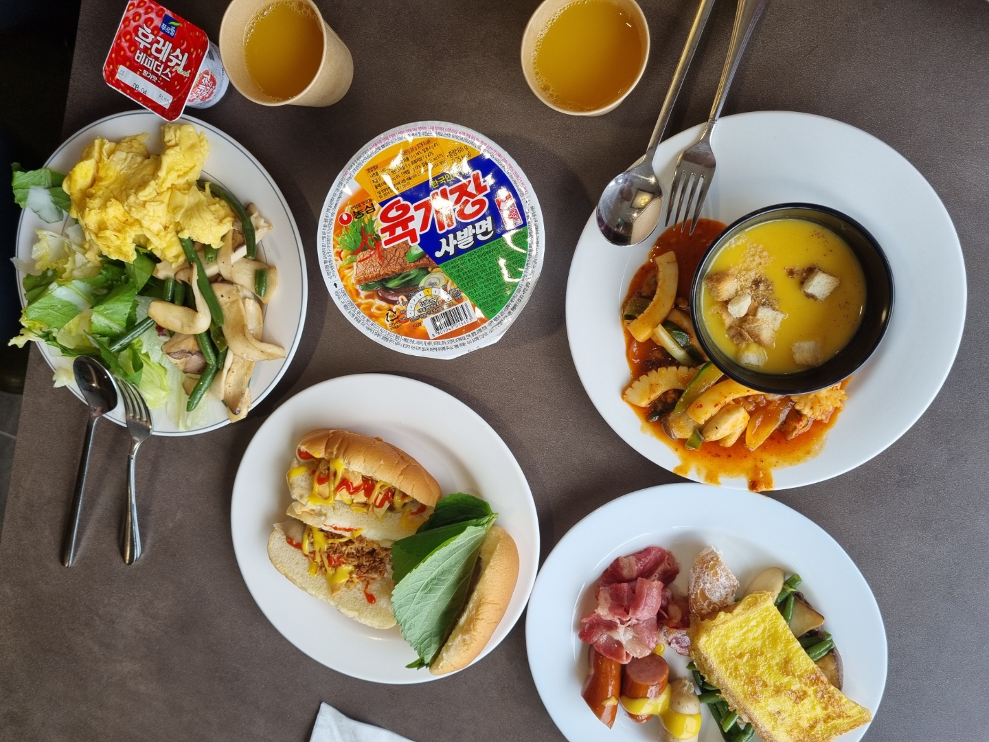 다음날 아침, 이곳의 별미. 진수성찬으로 상다리가 부러질 것만 같은 '조식'입니다. 서양, 동양식 중 택할 수 있고 직접 핫도그와 김밥, 나만의 크로플, 파히타 등을 만들어 먹을 수 있는 코너가 있어요.