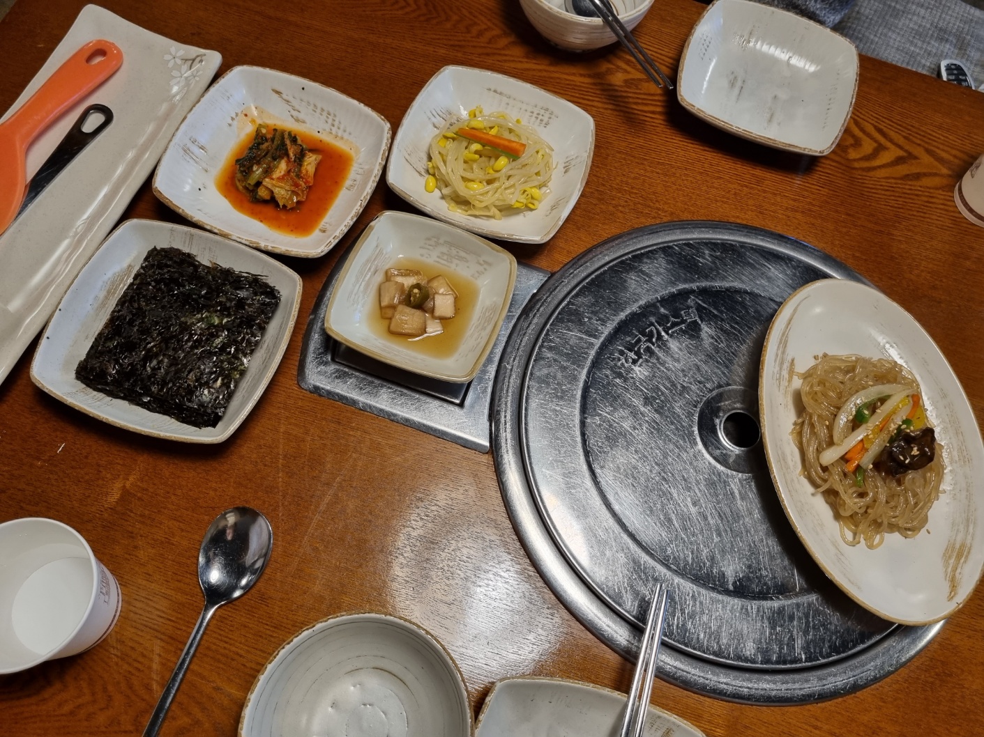 기본찬은 김치, 콩나물, 양파장아찌, 잡채와 김! 셀프바 이용하시면 원하는 찬을 더 가져와서 드실 수 있어요. 셀프바 뒷쪽에 있던 전복들, 싱싱하게 잘 관리되고 있는 듯 하죠?