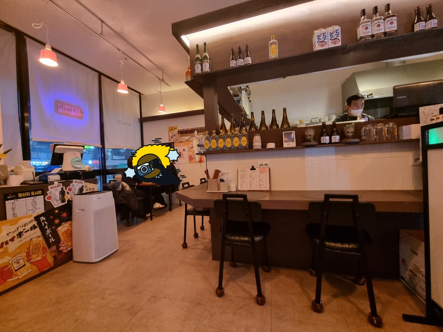 가게는 그리 크지 않아요. 오히려 단출하다는 표현이 맞을 거 같은데요. 4인석 테이블 2개와 2인석 1개, 바테이블이 있답니다. 바테이블이 있어서 혼밥 하기에도 괜찮은 곳 같아요. 전체적으로 따뜻한 색감의 디자인을 택했고 선반 위 조각상, 시계 등 사장님의 인테리어 감각이 돋보이는 제품들이 눈길을 사로잡아요. 특히 입구 옆 초밥 시계, 너무 탐나던거 있죠?