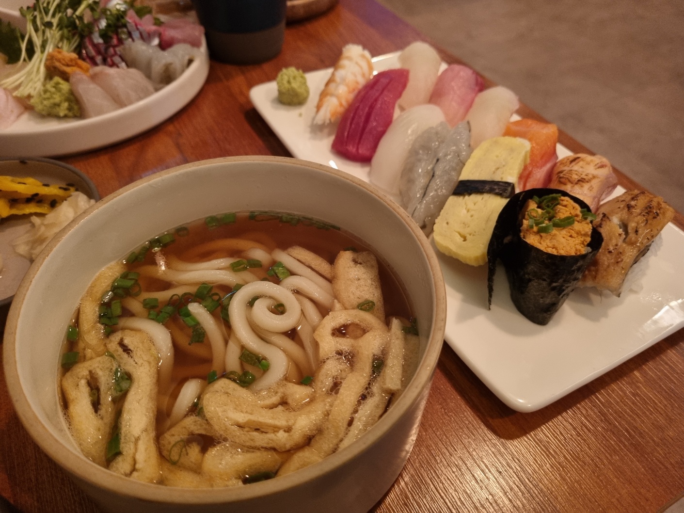 다음은 스시와 함께 미니우동이 나왔는데요. 일단 미니우동, 꽤 양이 많죠? 1인분까진 아니어도 꽤 양이 됐던 거 같네요. 면도 탱글탱글 잘 익었고 총총 썬 파와 유부와도 잘 어우러져요.
