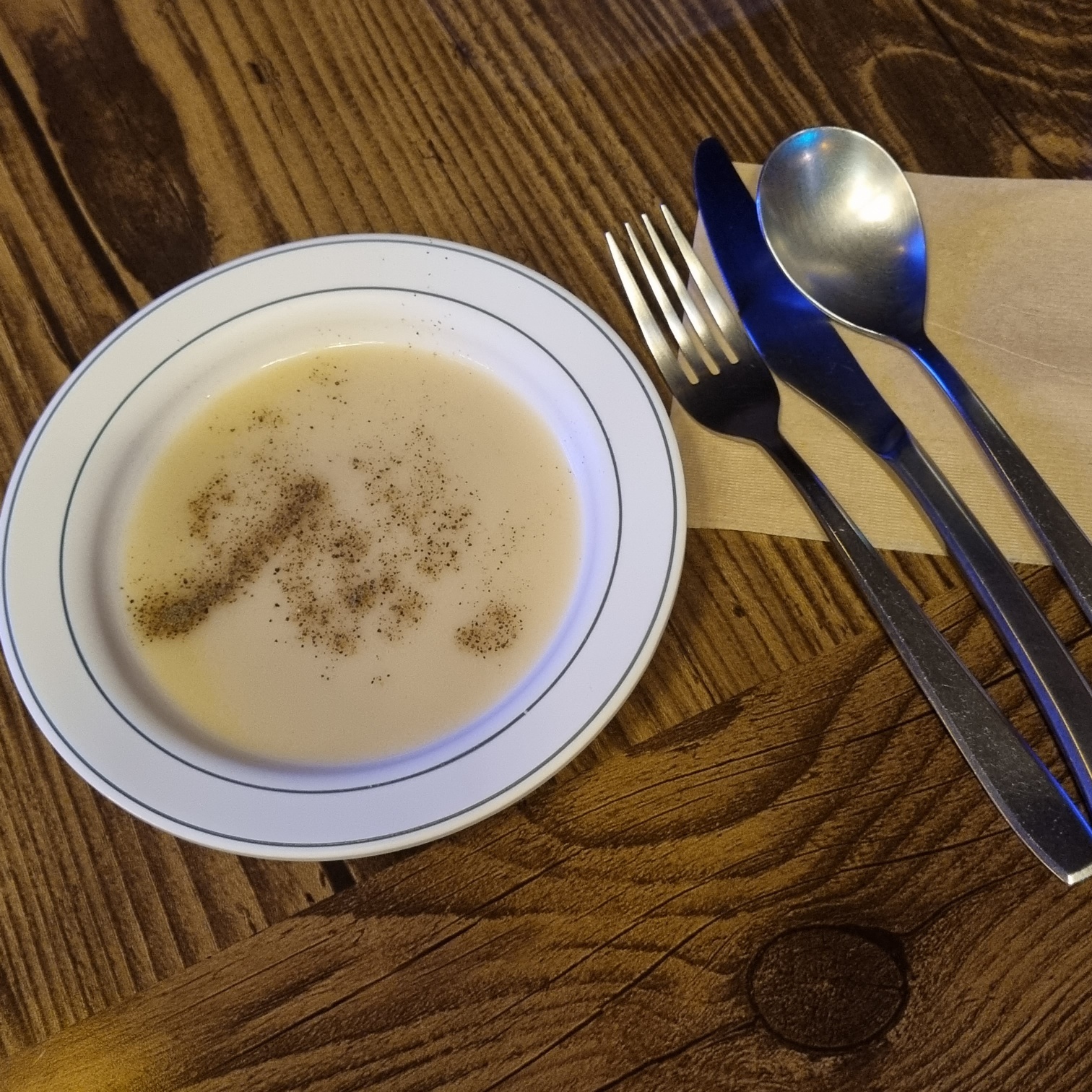 돈가스가 나오기 전 스프를 먼저 내어주십니다. 스프는 '누구나 어릴 적 한번쯤 먹어봤을' 그런 맛, 한눈에 봐도 딱, 경양식레스토랑의 스프인데요. 후추 솔솔 뿌리니 먹기도 전에 어릴 적 생각이 나 '맛있겠다'는 생각이 들었습니다.