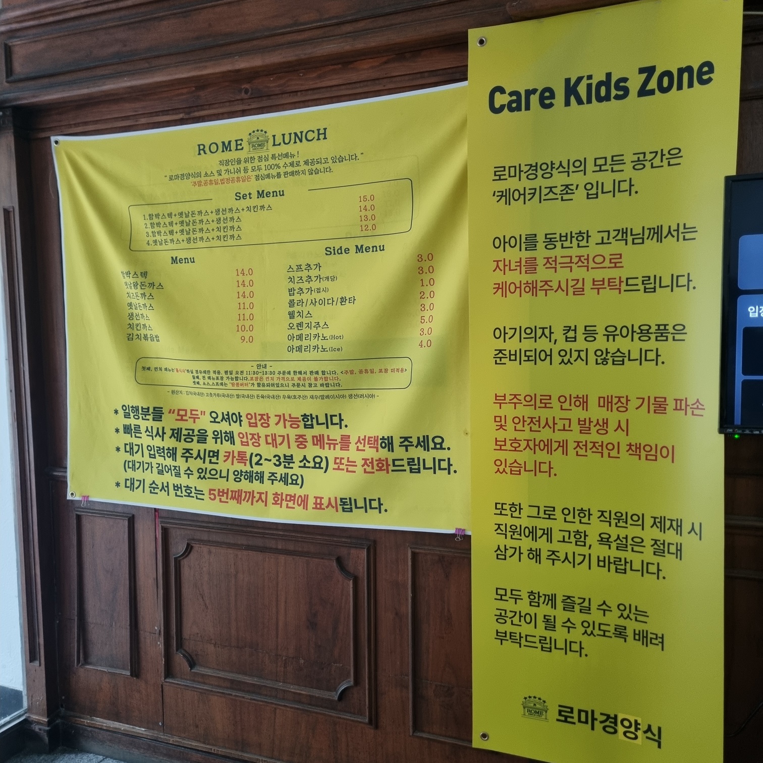 그만큼 인기있는 맛집이란 뜻일텐데요. 대기 번호 받고 인근 이디야 카페에서 기다리면 아메리카노 2500원에 먹을 수 있습니다. 매장에서 카톡 대기 인증 보여주면 된다고 안내돼있었습니다. 또 이디야 바로 옆에는 로마경양식 가게인데 포장만 전문으로 하는 곳이 있습니다. 줄 서서 기다리기 힘드시다면 이렇게 이용해보셔도 좋을 듯 해요.