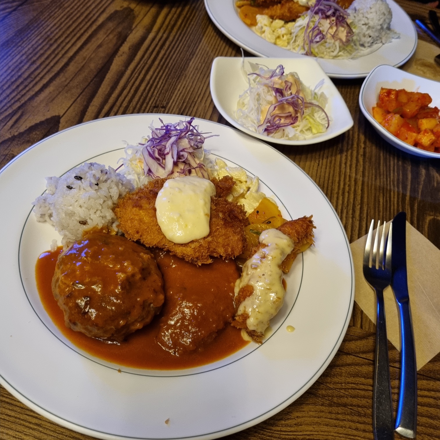 음식은 금방 나왔습니다. 딱봐도 배불리 먹을 수 있는 양. 제 입맛에는 치킨가스와 함박스테이크가 딱이었어요. 참고로 평소 치킨가스를 선호하지 않는 편인데 이곳 치킨가스는 바삭하고 따뜻해서 한입 베어무니, 파사삭 튀김가루가 기름진 맛을 내고 치킨은 상당히 담백해서 좋았습니다. 남편은 생선가스를 가장 맛있게 먹었다고 하네요.:)
